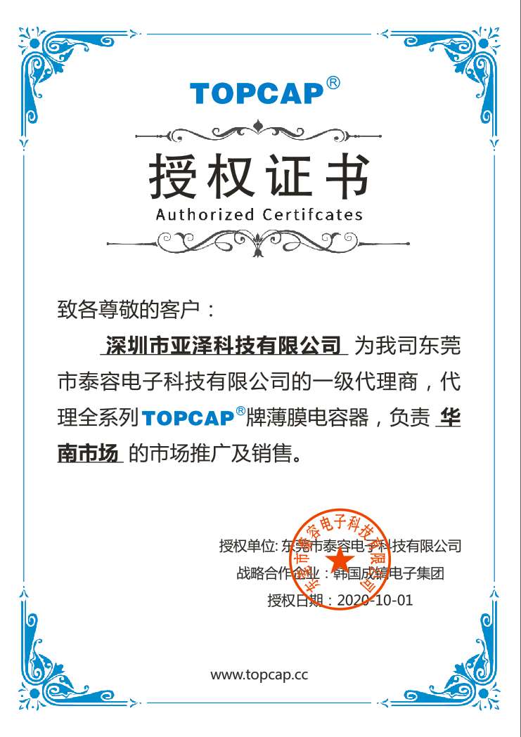 東莞市泰容電子科技有限公司授權(quán)我司為一級代理商,代理全系列TOPCAP牌薄膜電容器,負(fù)責(zé)華南市場的開發(fā)與推廣銷售。