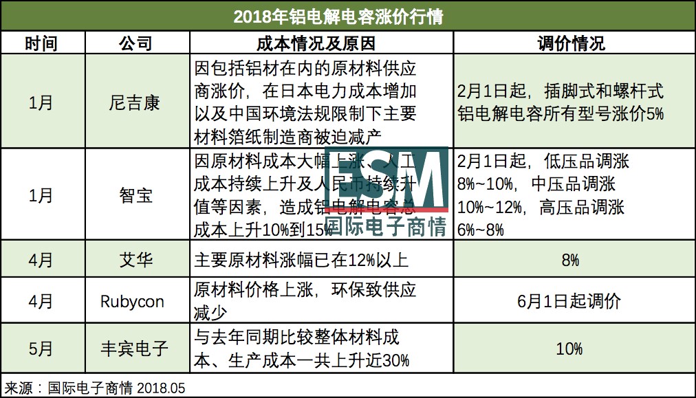 今年初尼吉康發(fā)布漲價(jià),國(guó)際電子商情,第一時(shí)間跟蹤報(bào)道,隨后臺(tái)系智寶宣布對(duì)其鋁電解電容產(chǎn)品全線調(diào)漲。4月底艾華宣布漲價(jià)。